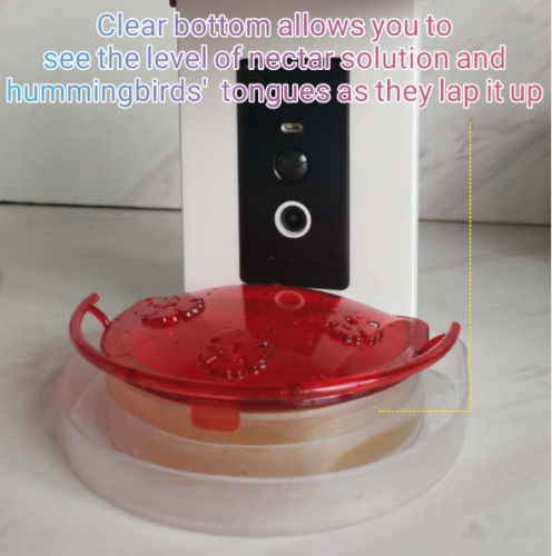 The transparent bottom design serves multiple purposes. Firstly, it allows users to have a clear view of the level of the nectar solution. This enables users to monitor the consumption of nectar and conveniently replenish it in a timely manner, ensuring a continuous food supply for the birds.Secondly, the transparent bottom provides a unique perspective that allows users to observe the tongue movements of hummingbirds as they lap up the nectar. Hummingbirds have incredibly rapid and flexible tongues that are adapted for feeding on nectar. By observing the process of hummingbirds feeding, users can appreciate the unique and intricate feeding behavior of these birds, enhancing the overall viewing experience.